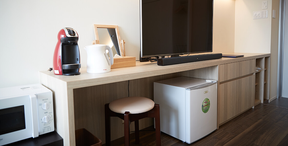 Bluetoothスピーカー、 ビューバス、テレビ、無料Wi-Fi、冷蔵庫、冷房、洋服掛け、温水洗浄便座、 洗浄トイレ、ヘアドライヤー、電子レンジ、コーヒーマシン、卓上ミラー